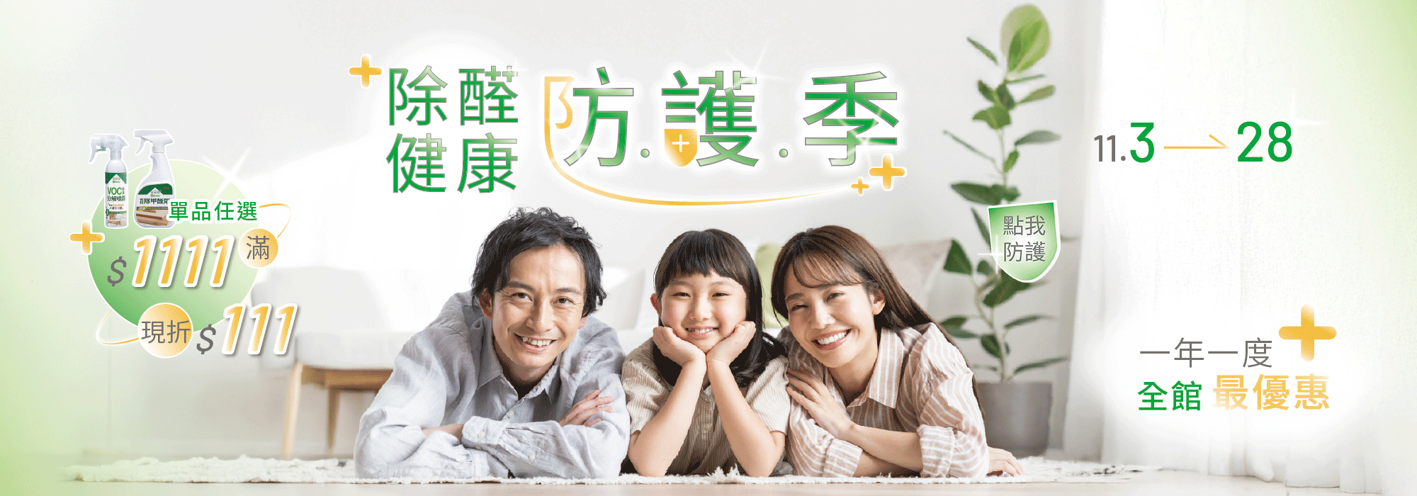 ☀️【除醛健康防護季】11/03 - 11/28,裝修後DIY除甲醛噴劑單品任選滿$1111現折$111(可累折!!)|熱門組合8折起|滿$1800再贈黃金盾碗盤潔淨慕斯300ml