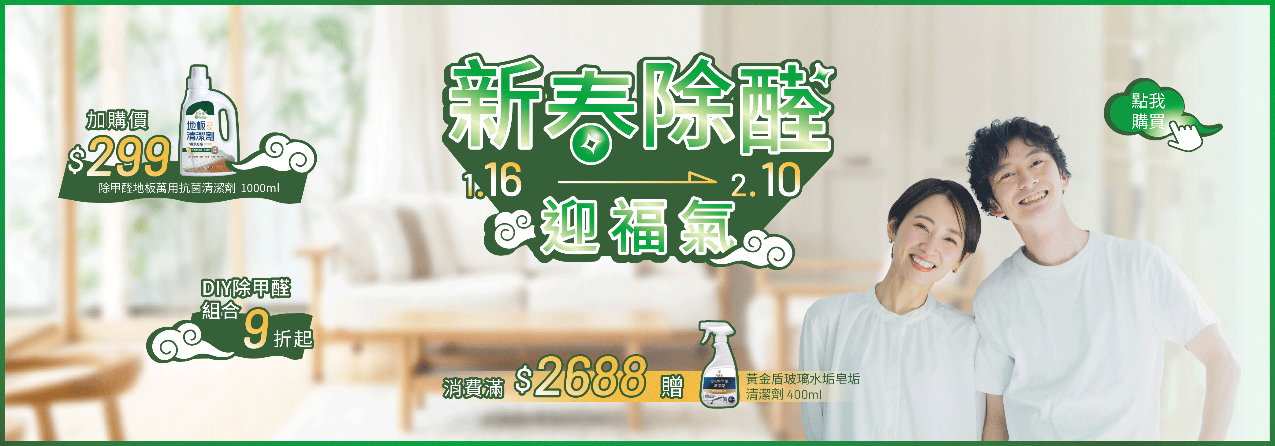 ☀️【新春除醛迎好運】01/16 - 02/10,裝修後DIY除甲醛熱門組合9折起|限時加價購【除甲醛地板萬用抗菌清潔劑】只要$299,滿$2688再贈【黃金盾玻璃水垢皂垢清潔劑】
