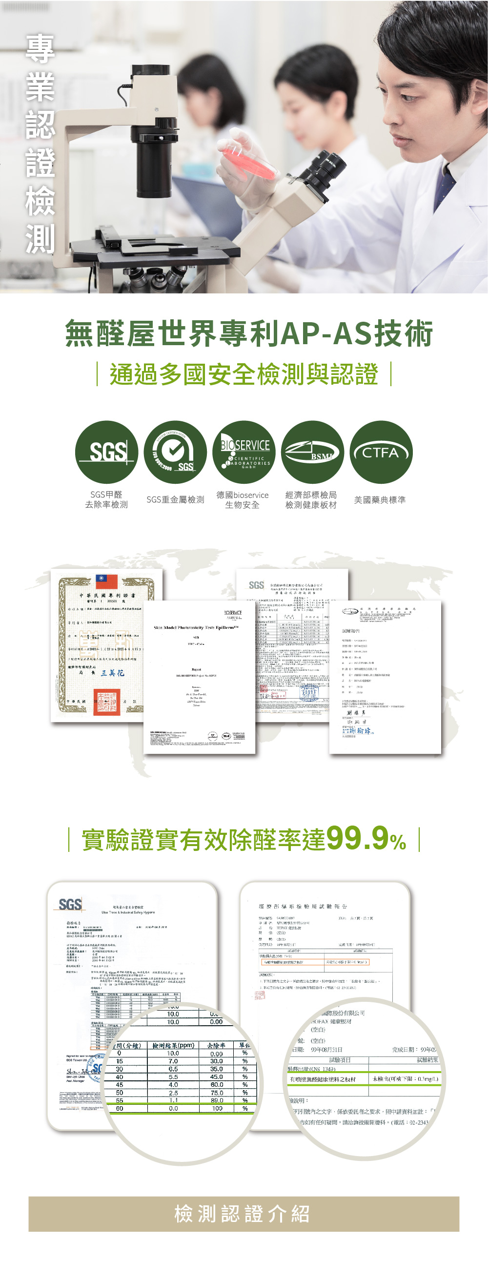通過德國BSL Bioservice八大項嚴謹的生物安全性測試,證明無醛屋產品沒有對於人體健康或是造成不舒適的潛在風險。長期使用甚至誤食也不會造成刺激、過敏、DNA改變…等。完全不會造成人體與寵物健康危害。
