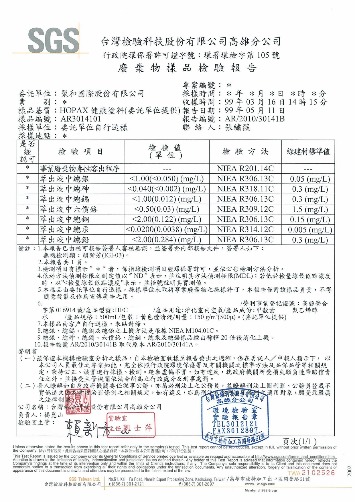 重金屬會透過飲食、呼吸或是直接接觸的路徑進入人體,但是重金屬不像其他的毒素可以在肝臟分解代謝,然後排出體外。相對的,它極易積存在大腦、腎臟等器官,漸進式的損壞身體正常功能。消費者可安心使用無醛屋產品,無重金屬檢出,安全無虞。檢測項目:檢驗日常生活中可能接觸到的重金屬,如鉛、汞、鎘、銅、鋅、鉻 、錳、鎳、砷。