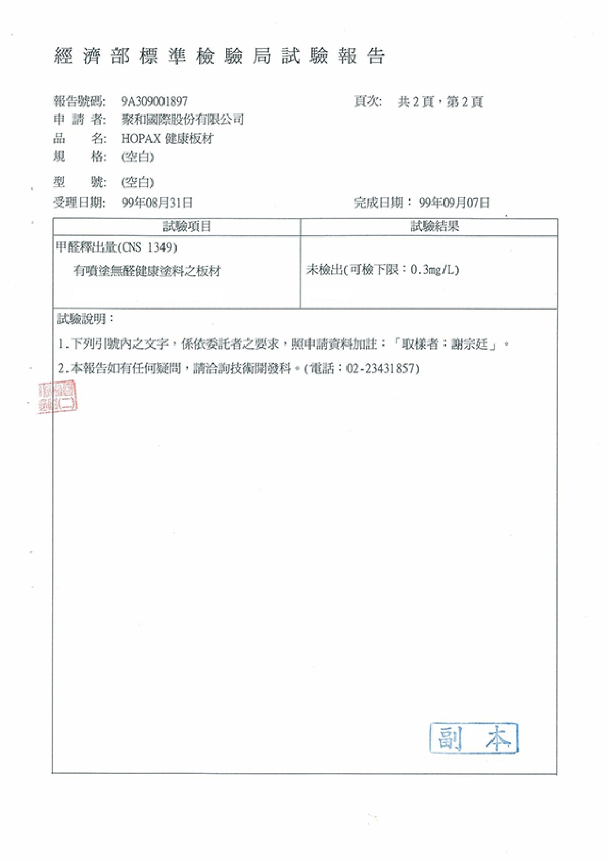 符合檢驗規定之市售商品本體上應有國家標準規定之甲醛釋出量符號F1、F2、或F3之任一種標示(3種符號中,阿拉伯數字愈小表示甲醛釋出量愈小)。未符合檢驗規定者不得輸入或內銷出廠販售。將無醛屋健康塗料噴塗後的板材經檢驗後,甲醛未檢出。