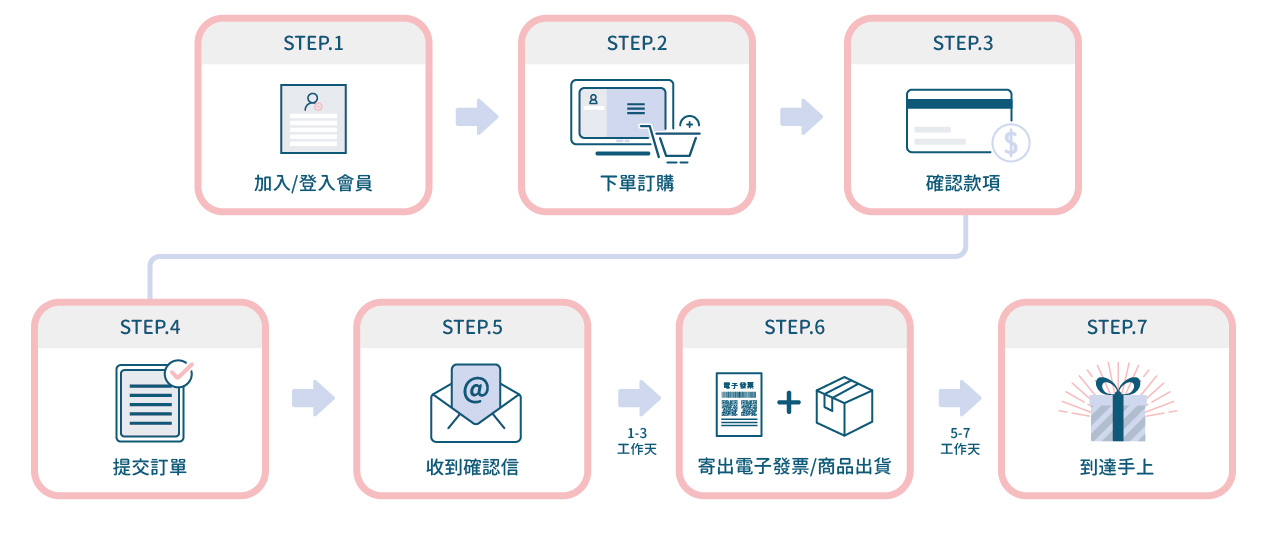 加入/登入會員→選擇商品→加入購物車→填寫資料與送貨方式→確認款項→工作日出貨→收到無醛屋商品