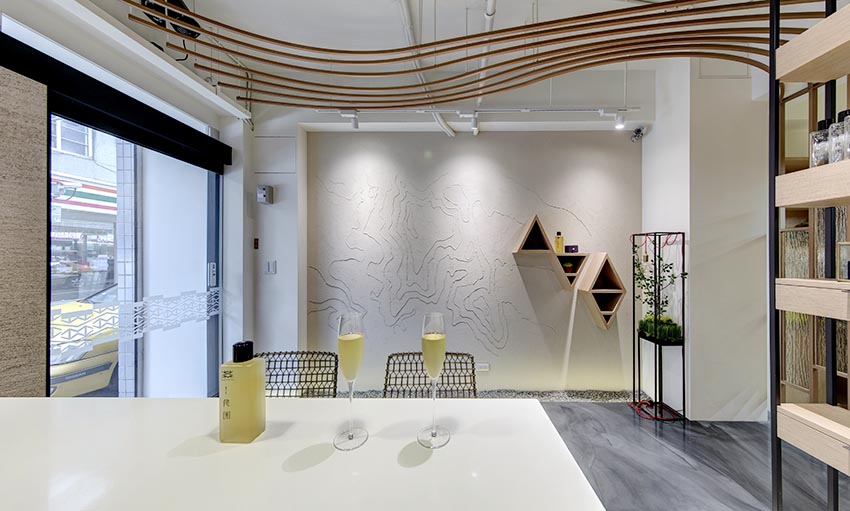 走在大街上時常看到正在裝修中的店家,每次都因粉塵與氣味讓人只想掩鼻迅速走過,對於即將要開門做生意的商業空間,刺鼻味道可不允許存在,一如我們這次拜訪的龍團茶行,甫進門除了令人驚豔的空間建材運用外,居然絲毫聞不到裝潢味,僅有茶香瀰漫!設計總監表示,正是因為秉持環保的重要性,更希望能貼近產品本身綠色茶葉特性,建材挑選上則格外嚴格,只選用經過環保認證的健康板材與塗料,像在入口處的牆面塗料,便是挑選珪藻土描繪出南投鹿谷山林線的地圖,除了清楚標示出丨龍團茶葉的出處來源,也同時發揮珪藻土除臭、吸濕、調節溫度的功效。