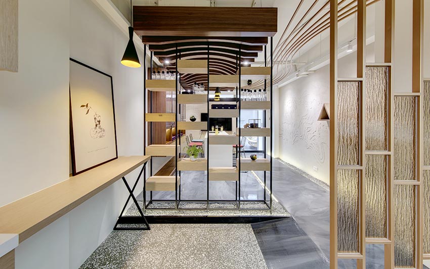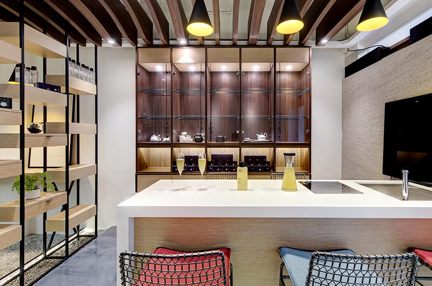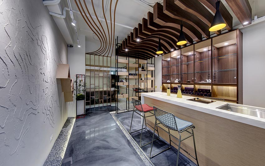 相比居住空間,需要更大量的收納與開放式陳列區域,擺放茶業、茶壺器具等相關產品,強調量身定製的規劃特性,設計總監選擇木作為主,並加上無醛屋健康塗料,把櫃子本身也成為健康板材,如此一來能更加安心擺放與飲茶相關的物件,除了嗅覺、視覺與味覺被健康圍繞外,連帶身體觸碰範圍也毫無安全疑慮,讓每位拜訪丨龍團的顧客,更安心的浸濡於茶文化之中。