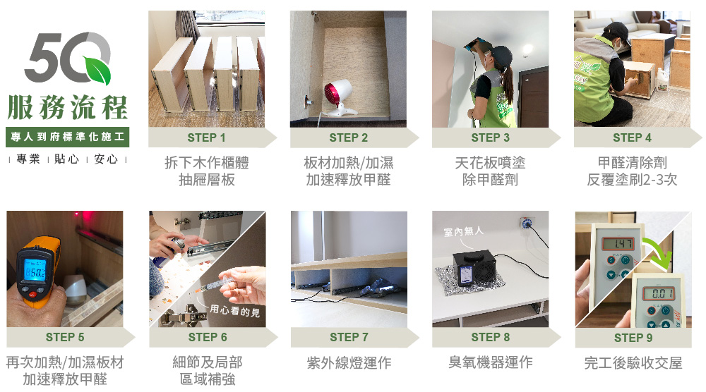 2. 使用針對台灣氣候獨家研發的專利天然塗料,並根據不同的面材提供專屬除醛材料。