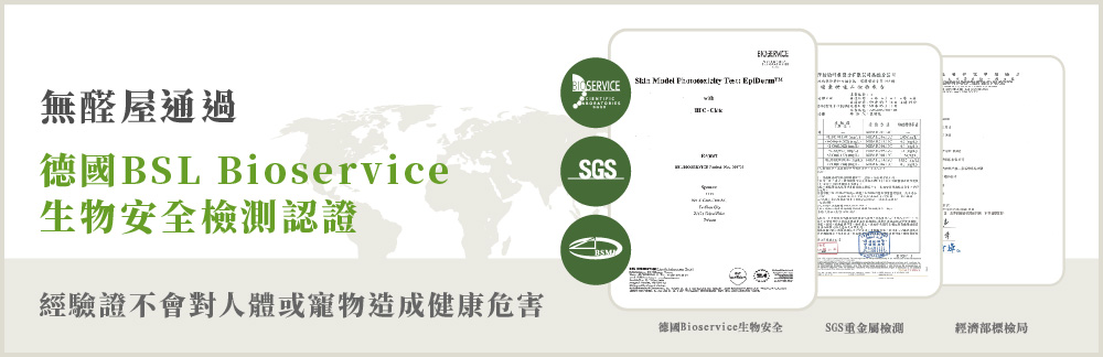 A:無醛屋產品通過德國BSL Bioservice八大項嚴謹的生物安全性測試及多樣檢測,經驗證不會對人體或寵物造成健康危害。即使長期使用也沒有刺激、過敏、DNA改變…等風險。