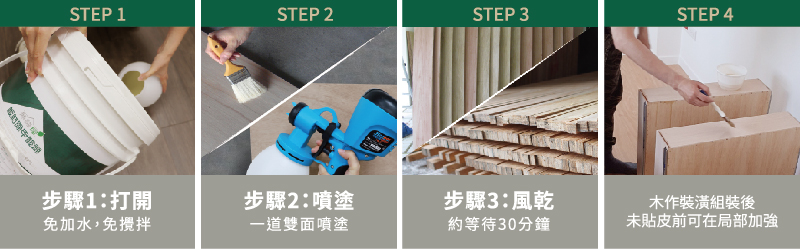 請木工師傅於板材正反面及角料四個面(裸材、未貼皮部分),使用噴槍噴塗一道—用量省、效果好、時間快或使用油漆刷於板材正反面及角料四個面刷塗一道。(注意:本塗料僅適用於裸材、未貼皮表面,實木無甲醛不需噴塗)