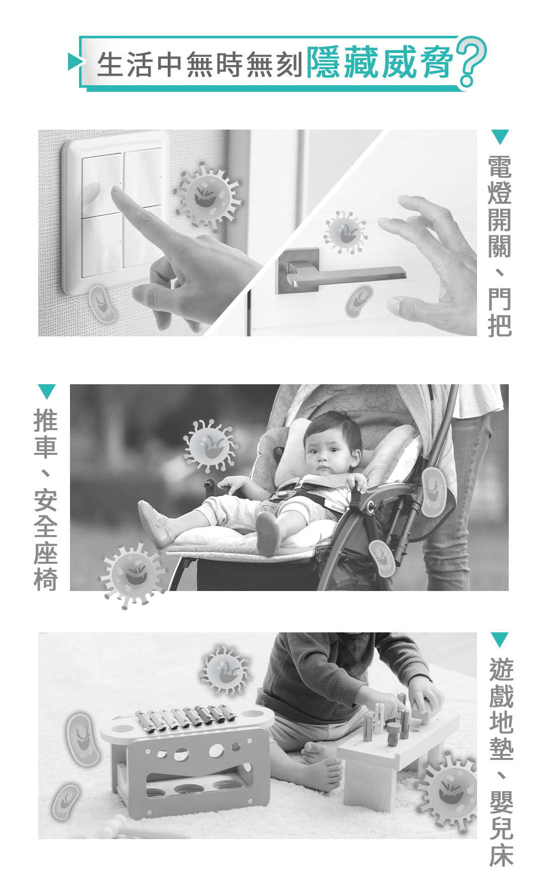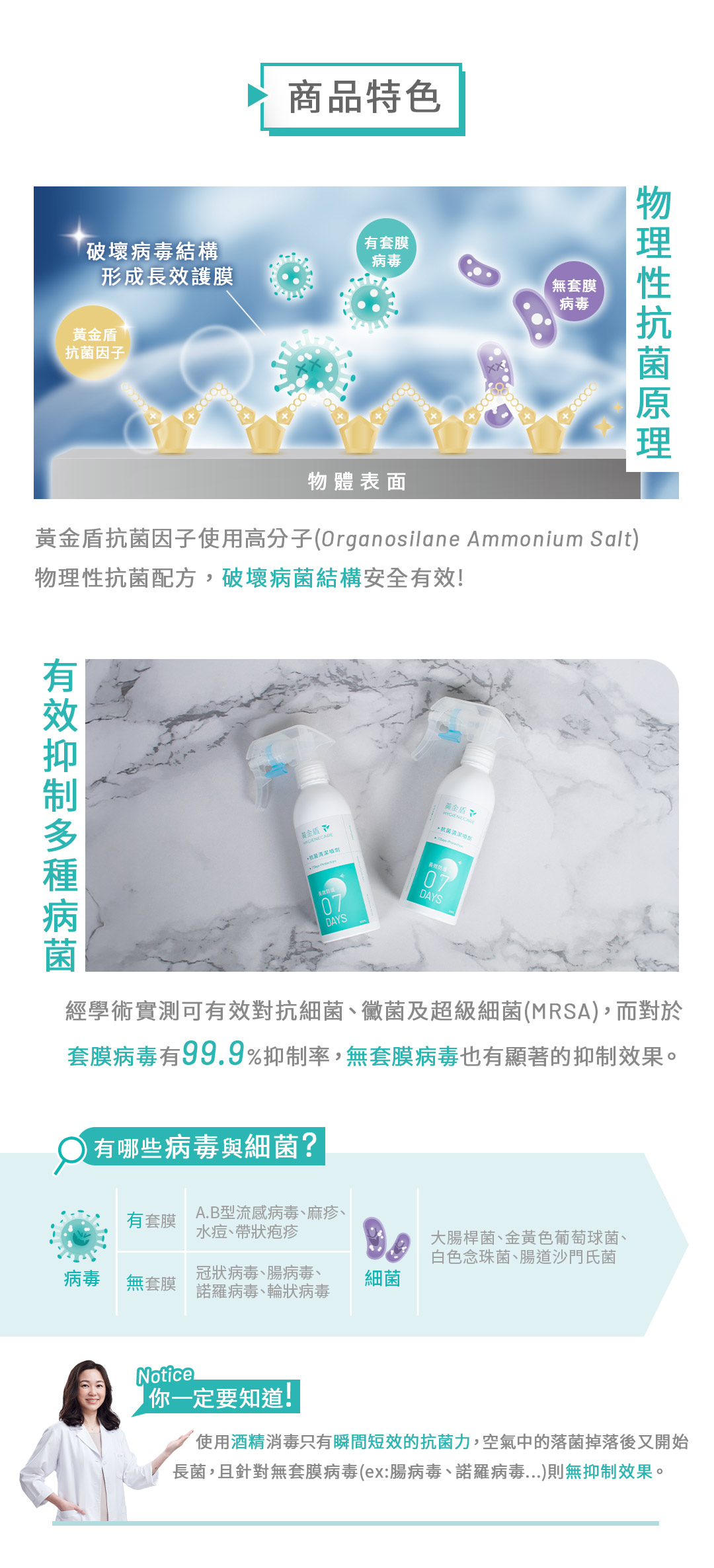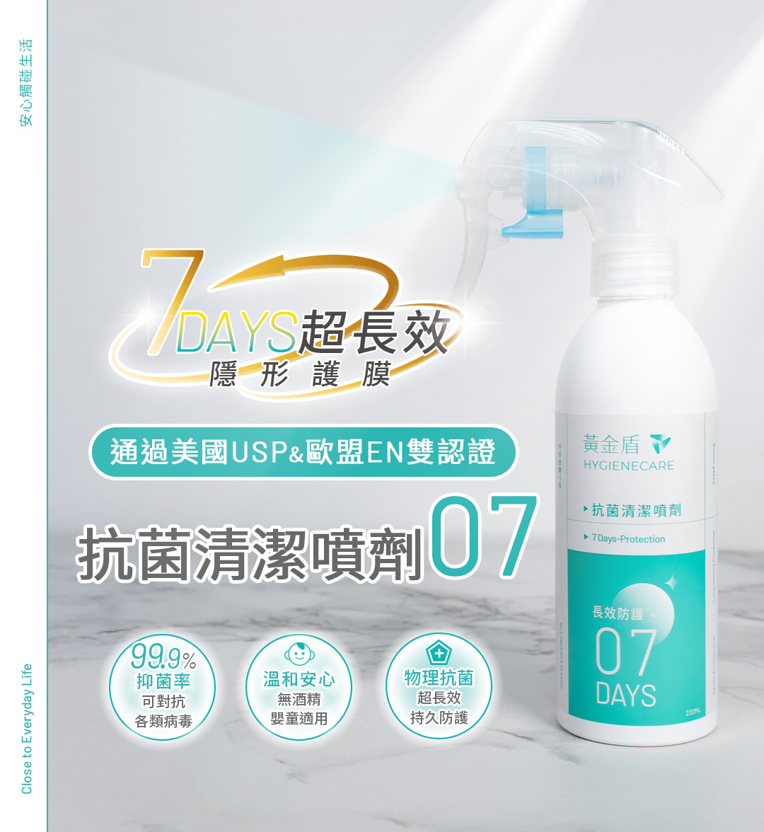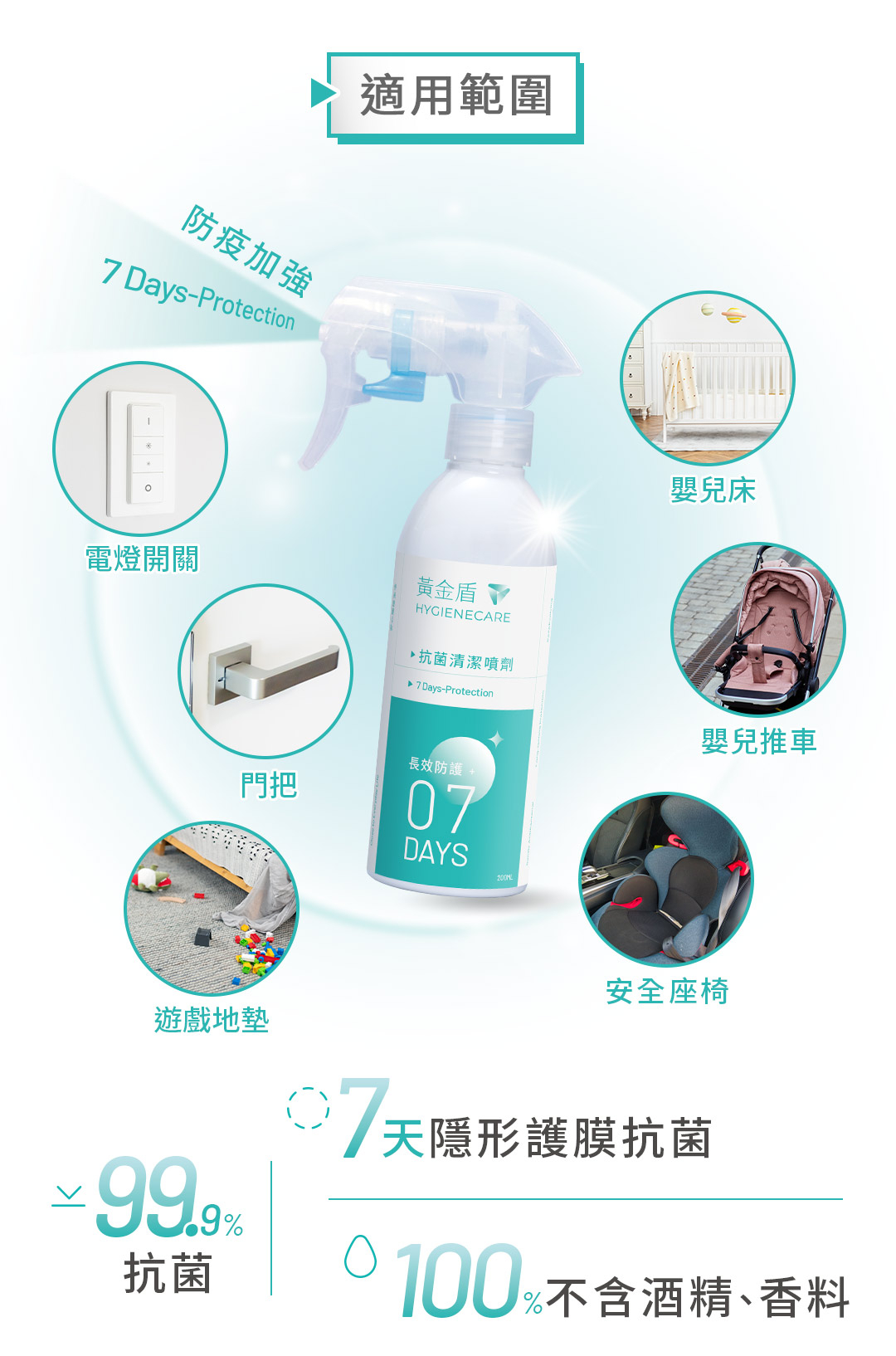 ►容量:200ml►用途:環境、物品表面清潔,適用於桌面、EVA地墊、嬰兒推車、安全座椅、公廁尿布檯、瑜珈墊、門把、捷運...等。►使用方法:使用前搖一搖,直接噴灑於任何物體、器具表面,噴拭後不需沖洗。►主要成分:有機矽氧烷銨鹽、水。►注意事項:請置於陰涼處。若不慎觸及眼睛,立刻以清水沖洗。如仍有不適請立即尋求醫師協助。►保存期限:3年。►產地:台灣。