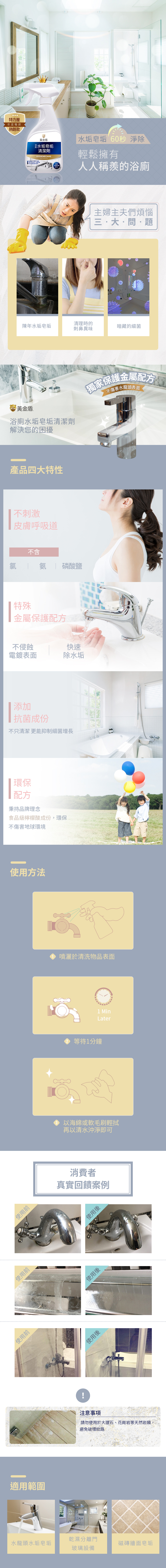 ►用途:浴廁水垢清潔。適用於乾濕分離玻璃、塑膠隔門、金屬水龍頭、浴室磁磚壁面、不鏽鋼洗手槽、浴缸等。