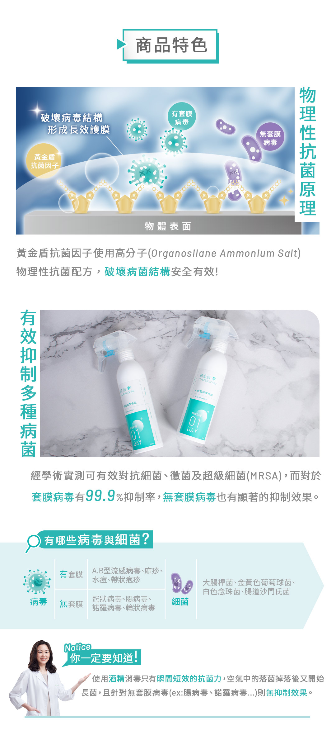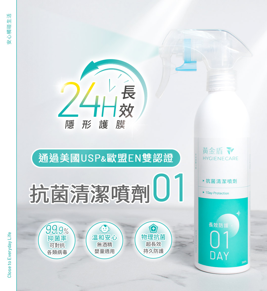 ►容量:250ml►用途:環境、物品表面清潔,適用於桌面/門把/座椅/馬桶蓋...等。►使用方法:使用前搖一搖,直接噴灑於任何物體、器具表面,噴拭後不需沖洗。►主要成分:有機矽氧烷銨鹽、水。►注意事項:請置於陰涼處。若不慎觸及眼睛,立刻以清水沖洗。如仍有不適請立即尋求醫師協助。►保存期限:3年。►產地:台灣。
